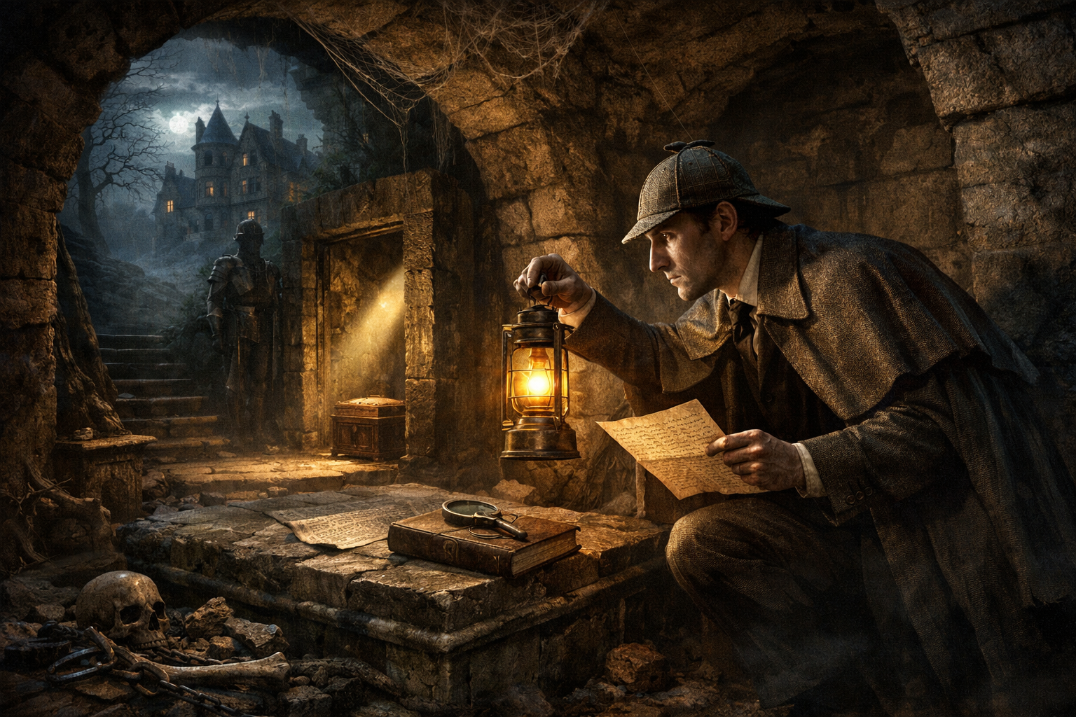 “Brunton, o mordomo, estava na biblioteca. Sentava-se, inteiramente vestido, numa poltrona, com uma folha de papel sobre os joelhos — algo que parecia um mapa — e a testa apoiada na mão, em profunda meditação. Fiquei mudo de espanto, observando-o da sombra. Um pequeno círio na borda da mesa derramava uma luz fraca, mas suficiente para mostrar que estava completamente vestido. De repente, levantou-se, caminhou até um escrivaninha lateral, destrancou-a e puxou uma das gavetas. Dali retirou um papel, e, voltando ao assento, abriu-o junto à vela sobre a mesa e passou a estudá-lo com atenção minuciosa. Minha indignação diante desse exame tão tranquilo de documentos de minha família venceu-me a ponto de eu dar um passo adiante; Brunton ergueu os olhos, viu-me parado na porta e saltou imediatamente de pé. Seu rosto ficou lívido de medo, e ele enfiou no peito o papel em forma de mapa que antes examinava.