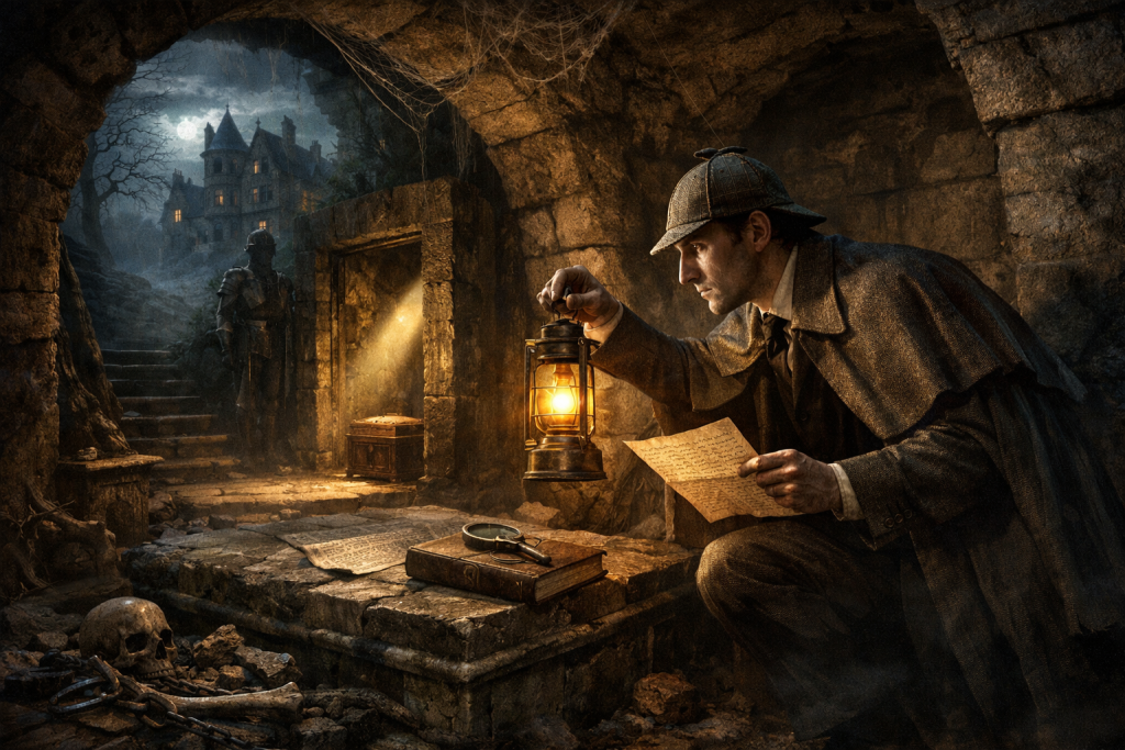 “Confesso que, até então, Watson, eu estava decepcionado com minha investigação. Eu contava com resolver tudo assim que encontrasse o lugar a que o Ritual se referia; mas agora que lá estava, parecia-me estar tão longe quanto antes de saber o que a família escondera com precauções tão elaboradas. É verdade que eu lançara alguma luz sobre o destino de Brunton; mas agora precisava descobrir como aquele destino o alcançara e qual o papel desempenhado pela mulher desaparecida. Sentei-me sobre um barril no canto e meditei cuidadosamente sobre o conjunto da questão.