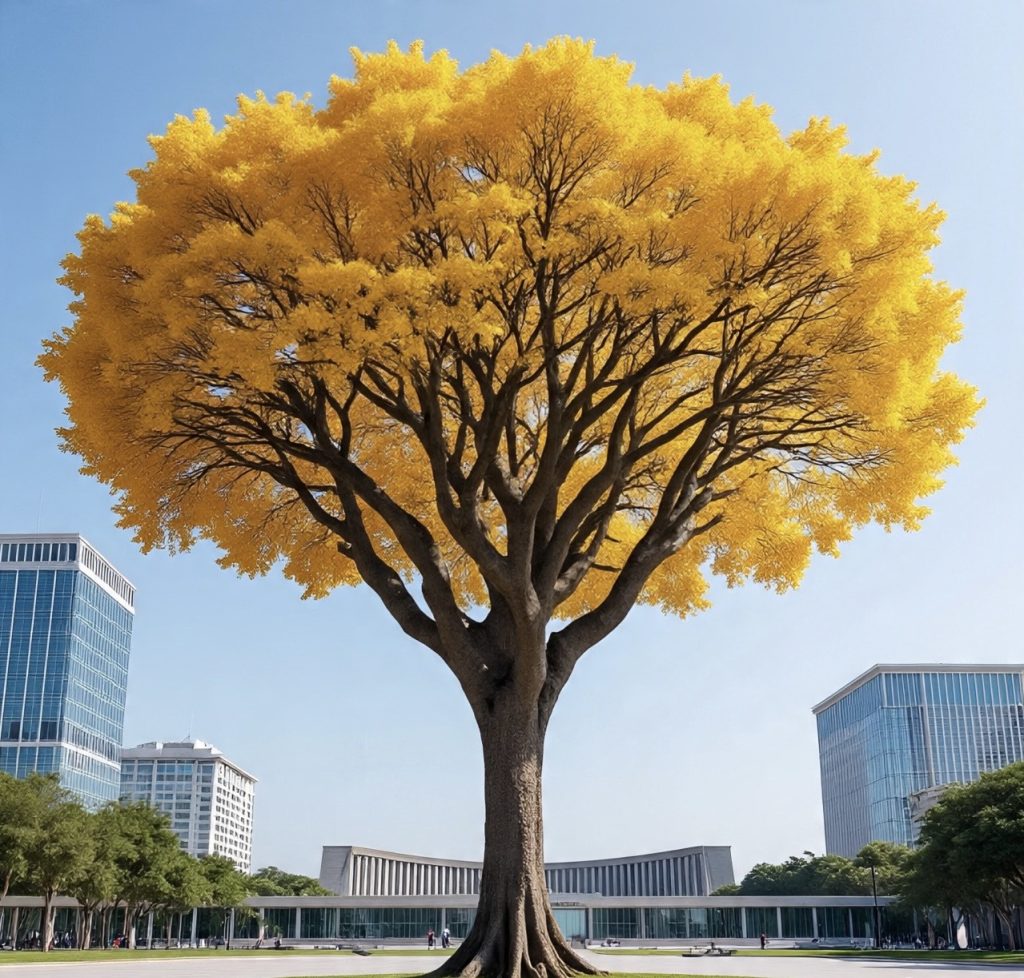 Atravessar uma tesourinha nos meses secos é ver o inesperado: um ipê em flor entre o concreto e o céu.