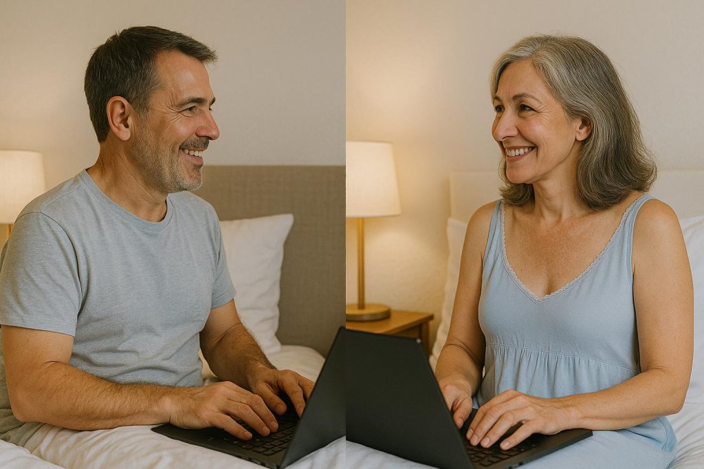 Ela digitava deitada, com a blusa, sem perceber, já aberta. Ele, olhos fixos na tela, não sentia mais o peso da solidão. Eram dois corpos separados por um simulacro de vidro e quinze anos, mas unidos por uma urgência que nunca morrera.
