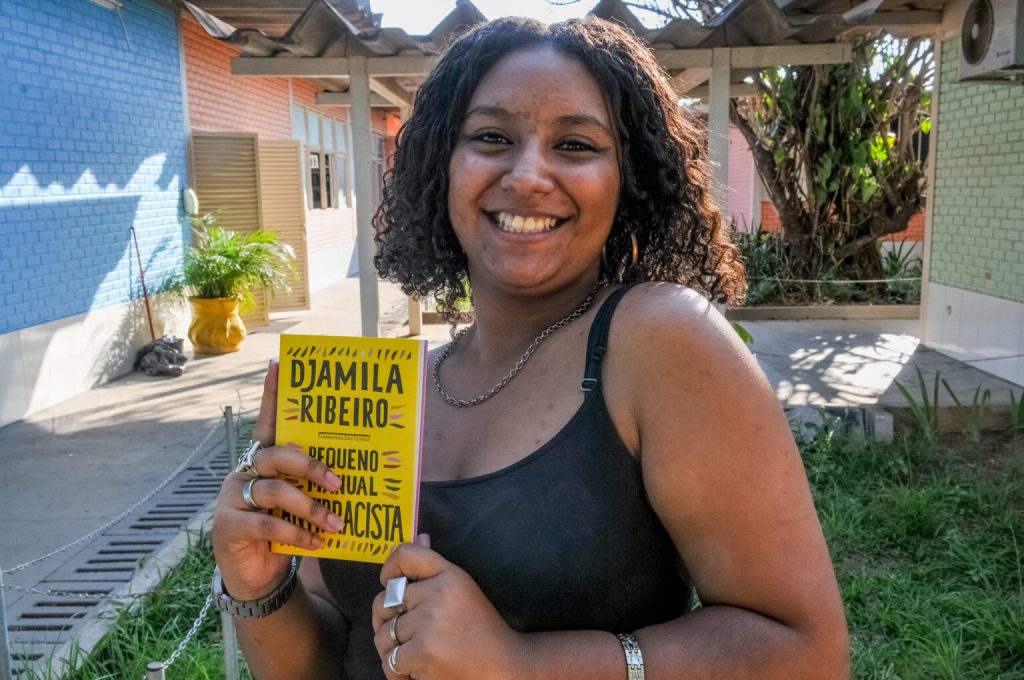 A aluna do terceiro ano Maria Eduarda Almeida, 17 anos, foi uma das agraciadas. Em uma banda formada por mais quatro colegas, ela interpretou uma música do repertório da cantora Iza. E levou para casa um exemplar do Pequeno manual antirracista, da escritora Djamila Ribeiro. Eduarda, que se autodeclara preta, disse que isso tudo tem a ver com ela.