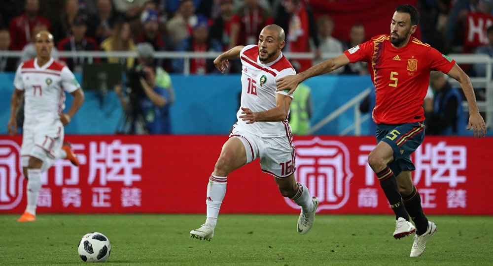 Quem esperava uma postura passiva de Marrocos se enganou e pôde constatar isso logo nos primeiros minutos. Agressivo, até fisicamente em alguns momentos, o time africano surpreendeu o adversário e largou em vantagem. Iniesta cometeu raro erro no meio de campo, que Boutaib aproveitou para arrancar sozinho desde o meio de campo. De frente para De Gea, finalizou sob o goleiro para comemorar.