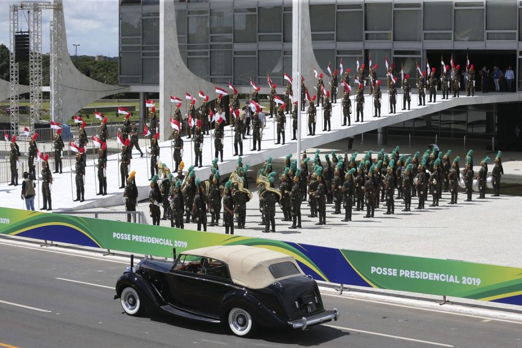 A previsão é que Bolsonaro chegue ao Planalto às 16h30 e receba a faixa presidencial logo em seguida. Na sequência, deverá fazer um pronunciamento oficial à nação. A recepção no Itamaraty está prevista para começar as 19h, após Bolsonaro ter recebido os cumprimentos de chefes de Governo e Estado e ter nomeado os novos ministros no Salão Nobre do Palácio do Planalto.