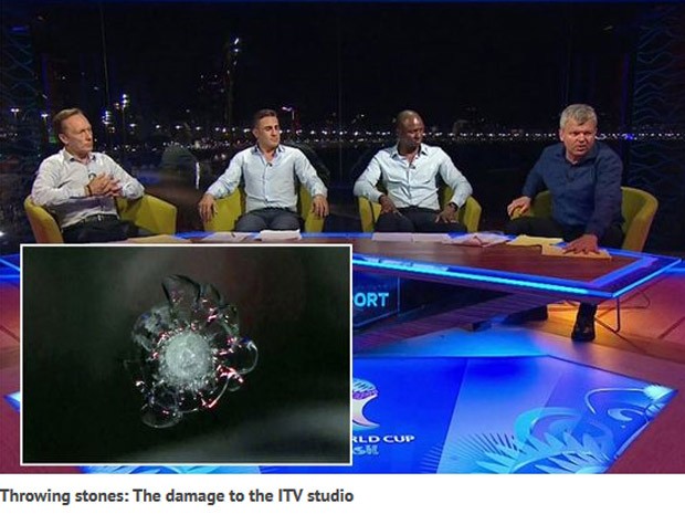 O estúdio da TV inglesa ITV foi apedrejado durante protesto na noite desta quinta-feira (12) em Copacabana, Zona Sul do Rio.