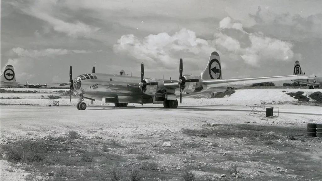 O campo de aviação, situado a cerca de 2.300 km a sudeste do Japão e cerca de 3.000 km a sudeste da China continental, carrega o status sombrio por ter servido como ponto de lançamento para os bombardeiros B-29 usados para lançar bombas atômicas sobre o Japão em 6 e 9 de agosto de 1945.
