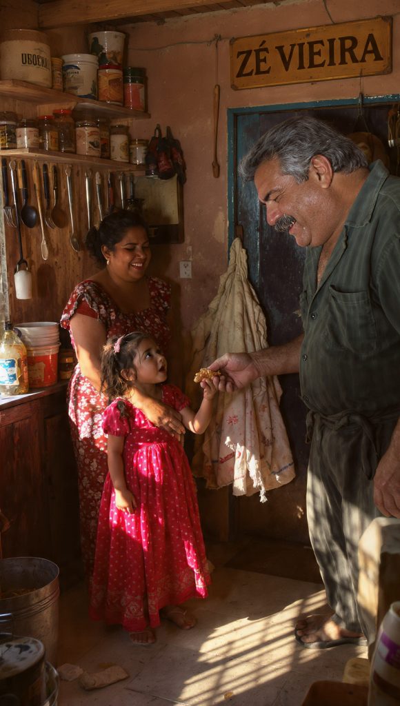 Chegamos perto do balcão. O Eurípedes chegou perto da Silmara Lúcia, pois era uma pessoa indefesa e gostava das crianças, e disse: “Você quer uma rapadurinha?” Falou com sua voz arrastada e sílaba por sílaba. Eu comecei a rir e falei: “Aceita, Silmara Lúcia, a ra-pa-du-ri-nha.” Esta menina quase desmaiou. De branca, ficou transparente e balançando a cabeça negativamente. Aí, eu disse para o Eurípedes que ela era boba e não queria, e tratei de proteger minha filha ou, então, ficava sem ela.