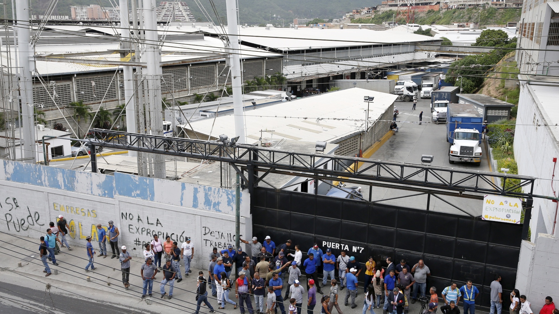 Cerca de 50 funcionários protestaram dentro do complexo, incluindo no topo de uma torre de água, com terceirizados se juntando a eles em solidariedade no lado de fora, num bairro pobre no oeste de Caracas.
