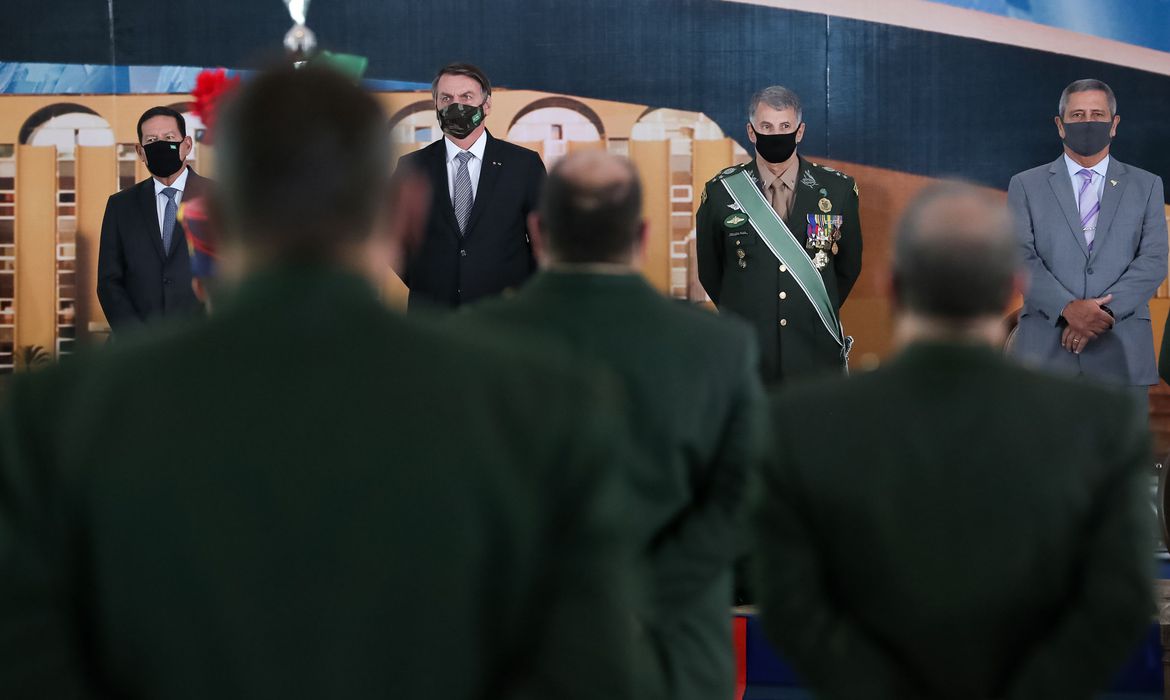 O presidente Jair Bolsonaro participou nesta quinta (8) da solenidade de promoção de 16 oficiais-generais do Exército, no Clube do Exército, em Brasília. Ao parabenizar os recém-promovidos, Bolsonaro disse que a corporação representa “uma estabilidade” para o Brasil, em especial neste momento de crise.