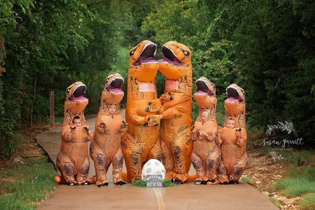 A norte-americana Nicole Berkley, do Texas, nos Estados Unidos, descobriu, no começo do ano, a gravidez do seu quinto filho e resolveu dar a notícia a todos de uma maneira nada convencional: ela comprou fantasias de dinossauro para ela, suas crianças e seu marido vestirem.