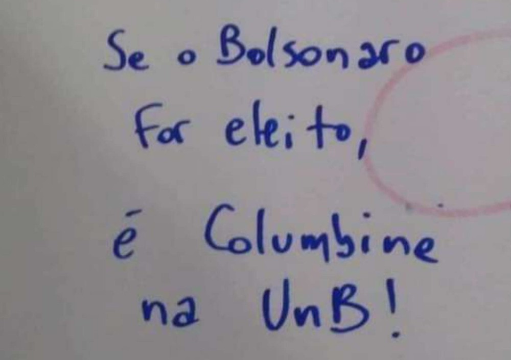 Sem revelar muitos detalhes, a Universidade de Brasília (UnB) confirmou a denúncia de uma pichação na porta de um dos banheiros da instituição com a ameaça de um massacre no campus caso o candidato do PSL à Presidência, Jair Bolsonaro, vença as eleições.