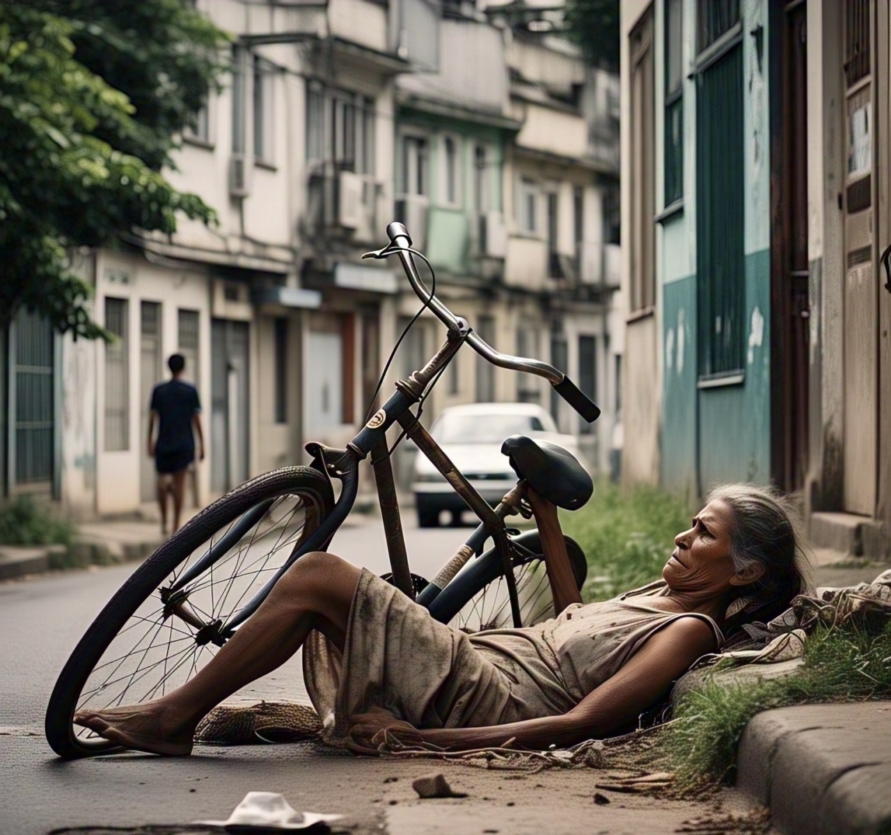 – Fui atropelada por uma bicicleta – respondeu a provável sem-teto (mentira minha, na época ela seria chamada de mendiga, de moradora de rua, no mínimo de indigente, mas foi o termo “mendiga” que veio à cabeça de Antônio). – Me feri naquela pedra – apontou para uma irregularidade no calçamento, perto do meio-fio. – Está doendo pra caramba!