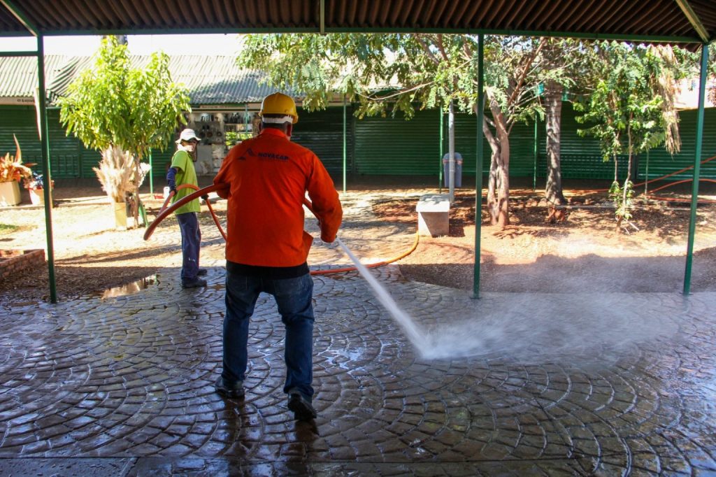 Foram higienizados os espaços comuns de toda área externa dos boxes e da praça de alimentação, bem como as calçadas e os arredores dos banheiros. Para evitar desperdício em meio ao período de seca, a Novacap utiliza água não tratada e imprópria para o consumo humano, servindo adequadamente para esse tipo de serviço.