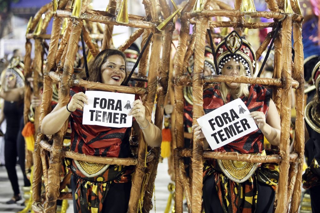 A Paraíso do Tuiuti, segunda colocada do carnaval, que se reapresentou na madrugada, criticou o governo abertamente num desfile sobre a escravidão. Debochou da Reforma Trabalhista e dos protestos contra a ex-presidente Dilma Rousseff (PT) e chegou a retratar Temer como um vampiro com a faixa presidencial