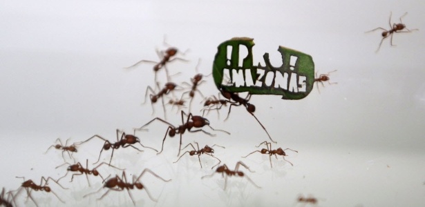 Durante esta “manifestação”, as formigas cortadeiras – uma espécie que vive nos trópicos – transportam pedaços de folhas da árvore nas quais os ativistas do Fundo Mundial para a Natureza (WWF) gravaram suas reivindicações, com slogans como “Salvemos a Amazônia”, “Solidariedade” ou “Merkel, ajude”.