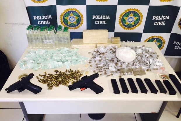 De acordo com os policiais, foram apreendidos cinco quilos de pasta base de cocaína, 35 frascos de lança perfume, 550 sacolés de maconha, dez comprimidos de ecstasy, 290 sacolés de cocaína, além de duas pistolas Glock, calibres 9 mm e .40, 10 carregadores e 97 munições.