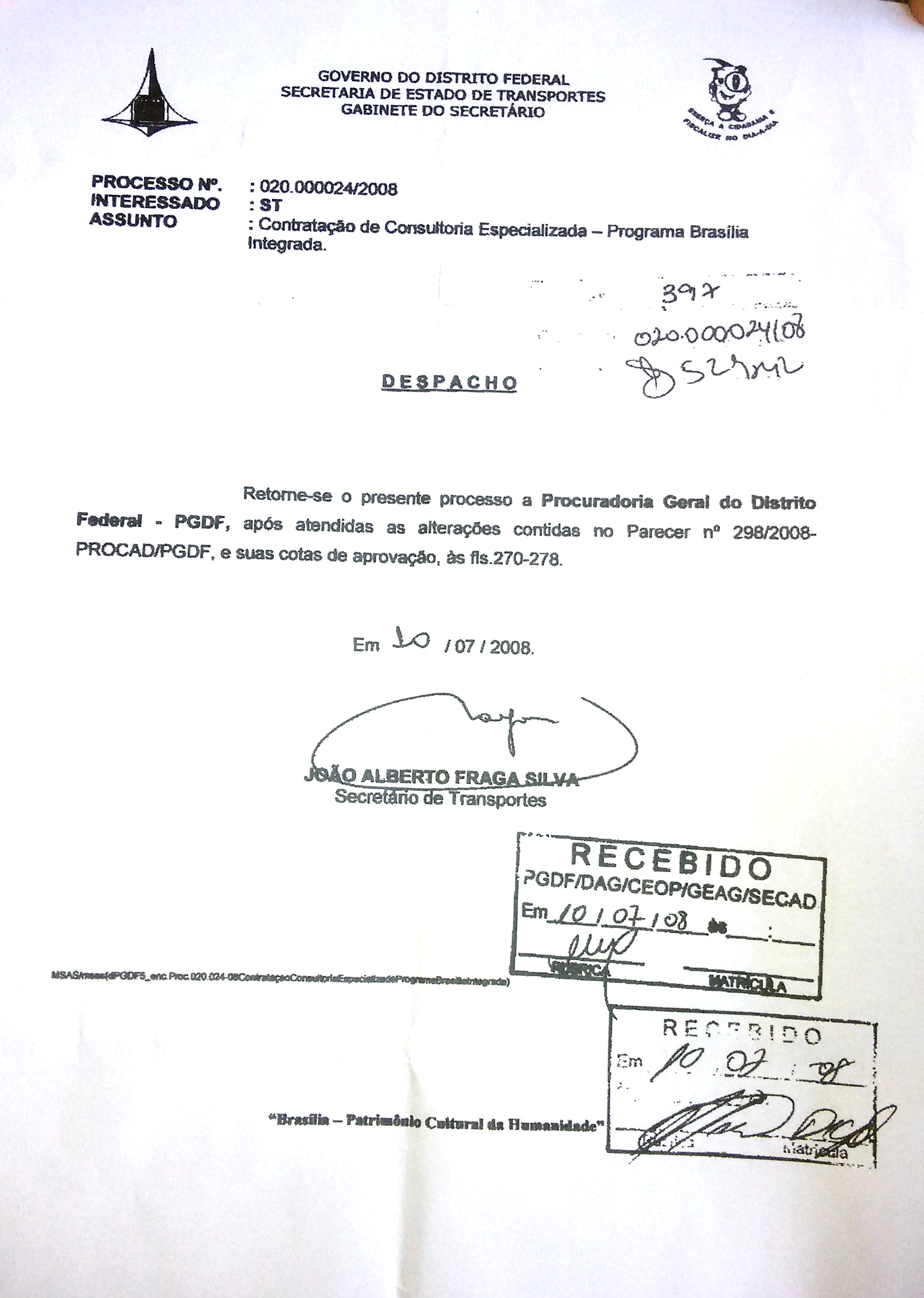 Documentos revelam que no governo de José Roberto Arruda, o então Secretário de Transporte, Alberto Fraga, eleito deputado federal com dinheiro do propinoduto conseguido através de Gim Argello, assinou convênio com o escritório de Garone Reck, o que serviu de base na fraude do certame no governo petista.