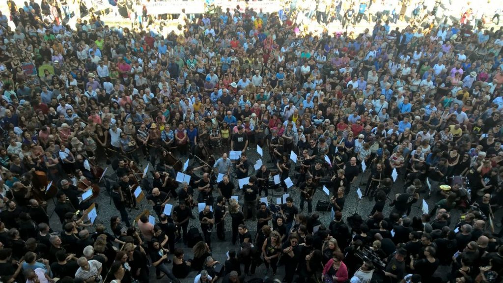 O ato de hoje foi realizado na escadaria do Theatro Municipal e se encerrou ao som da música Apesar de Você, de Chico Buarque, cantada com a participação do público.