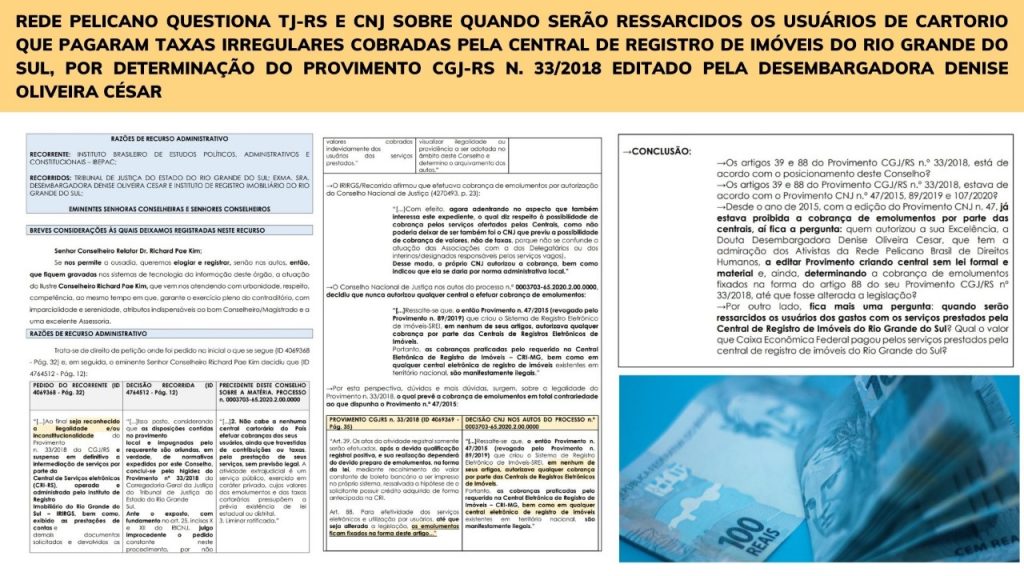 Para a Rede Pelicano Brasil de Direitos Humanos, os valores cobrados ilicitamente pelo Instituto de Registro Imobiliário do Rio Grande do Sul, através do Provimento n. 33/20158, editado por Denise Oliveira Cesar, devem ser devolvidos aos usuários de cartório e para a Caixa Econômica Federal, empresa pública sujeita a controle externo pelo TCU e CGU.