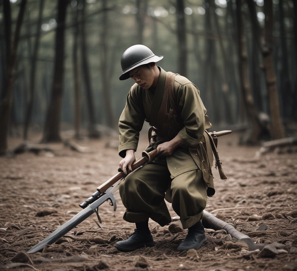 – Hai! – brada o soldado. Pega a lâmina da baioneta e a crava no abdome, morrendo com dores terríveis.