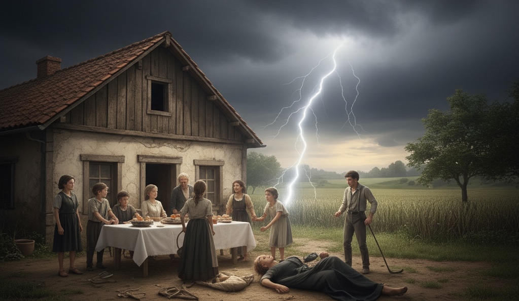 Foi em um desses domingos, durante o almoço, que ocorreu a primeira tragédia em família. Genésio acabara de completar 17 anos. O céu estava carregado de nuvens cinzentas ameaçando uma grande tempestade e no exato momento em que se sentaram para iniciar a refeição e agradeciam a Deus por ela, um raio traspassou o colchão espesso e escuro de nuvens, interrompendo por um instante o aspecto noturno do dia e, numa fração milésima de segundo, atingiu o corpo da mãe, atirando-a ao chão. Antes que o estrondo pudesse chegar aos ouvidos dos comensais, estava morta, fulminada pela descarga elétrica.