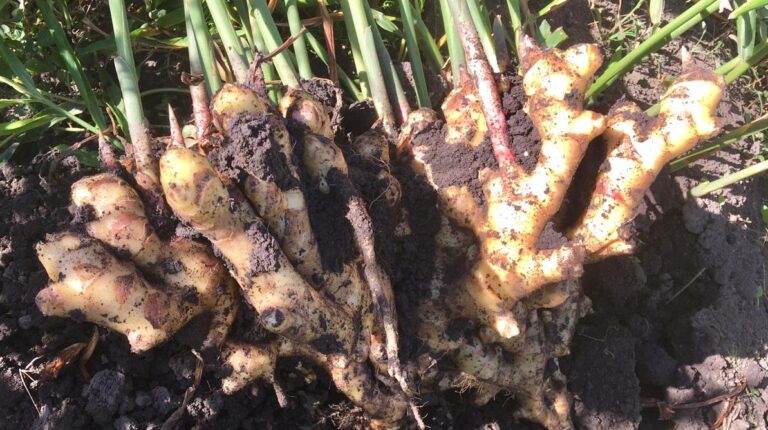 “O segundo ponto é o trato cultural chamado de amontoa. A amontoa consiste em colocar terra junto aos pés das plantas, para recobrir os rizomas que começam a aparecer na superfície”, afirma Adriana. “Recomenda-se iniciar as amontoas quando as plantas de gengibre estiverem com cerca de 30 cm de altura”, explica.