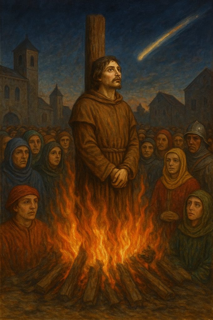 Hoje, sua estátua no Campo de’ Fiori — erguida em 1889 — recorda que a chama que o consumiu não foi a do inferno inquisitorial, mas a do fogo da sabedoria, que continua a arder no coração daqueles que buscam compreender o mistério da existência em sua unidade cósmica e divina.