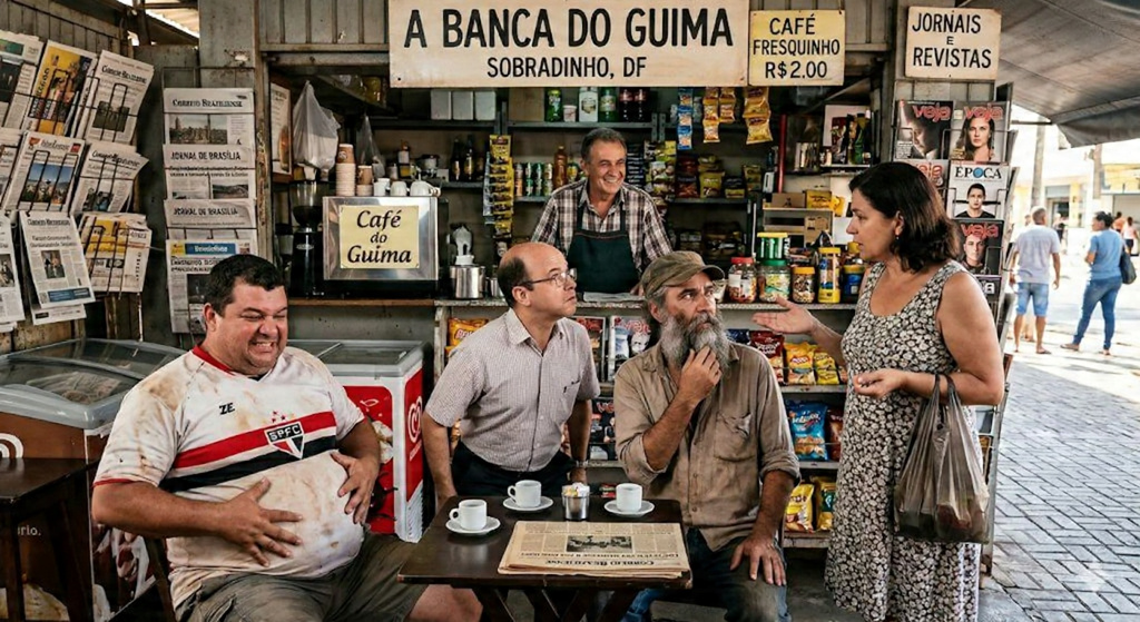 A Banca do Guima, famoso ponto de encontro em Sobradinho, fica na aprazível região serrana do Distrito Federal. Além de jornais, revistas, salgadinhos, picolés, refrigerantes e aquele cafezinho, o local reúne a clientela mais esdrúxula da cidade. Como diz o próprio Guima, “aqui é uma verdadeira Escolinha do Professor Raimundo, onde todos têm a chance de protagonizar algo inusitado”.