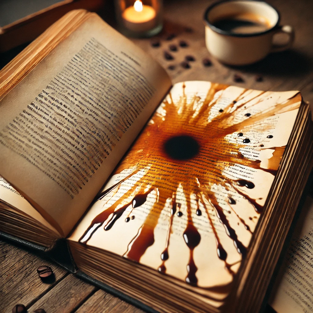 Indignada por não ter conseguido convencer o chefe e ainda tendo que deixar o conforto do lar, tomo mais um gole de café e na pressa, a xícara tomba e derrama o liquido no precioso livro.