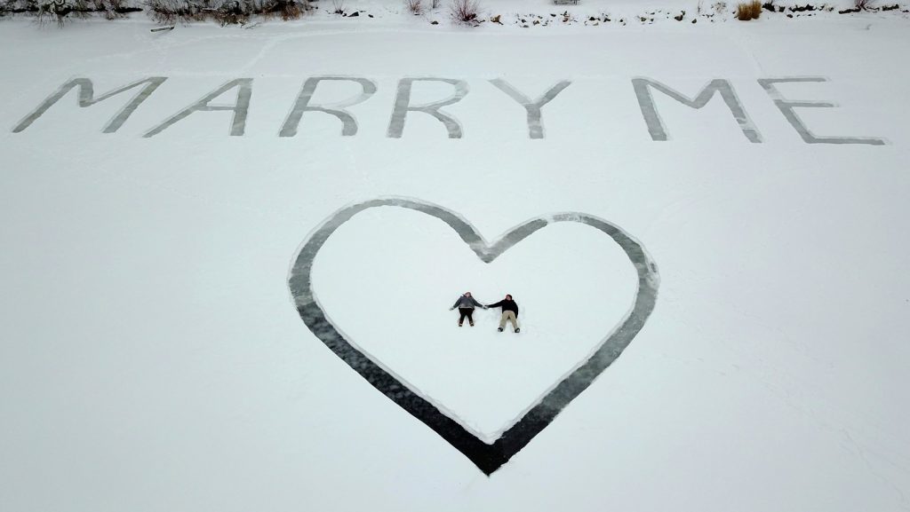Becker contou que teve a ajuda de sua família para desenhar as letras do pedido “Marry me” (casa comigo) e o coração, com um cortador de neve, sobre o lago Eight Crow Wimng.