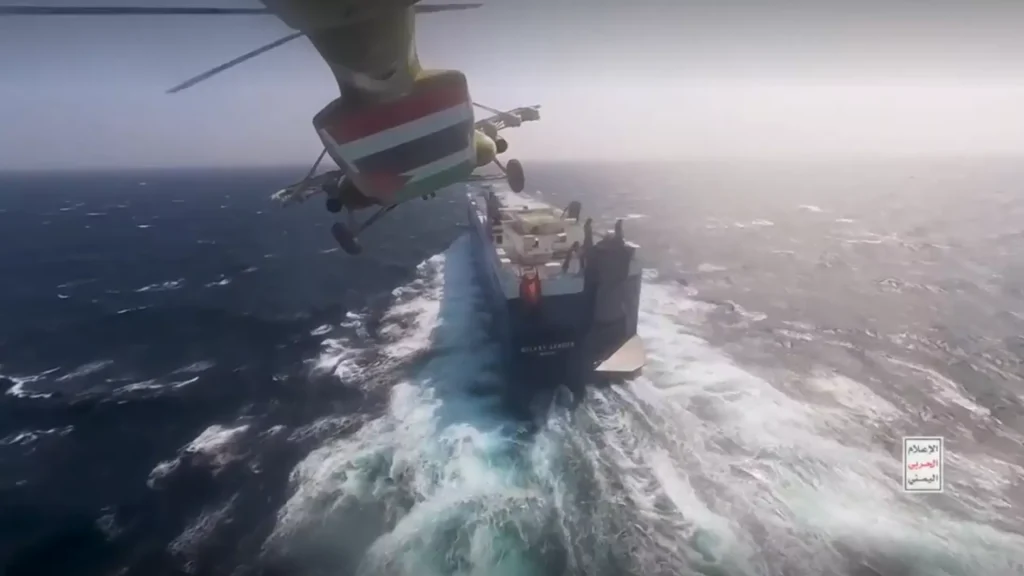 O Movimento Ansar Allah (Houthi) do Iêmen divulgou imagens mostrando milicianos a bordo de um helicóptero perseguindo, abordando e apreendendo o cargueiro Galaxy Leader Ro-Ro no Mar Vermelho.