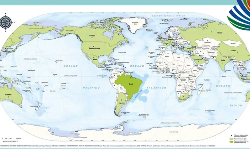 O mapa-múndi tem a marcação dos países que compõem o G20 e dos que têm representação diplomática brasileira, além de algumas informações básicas sobre o país, como população e área, entre outros dados.