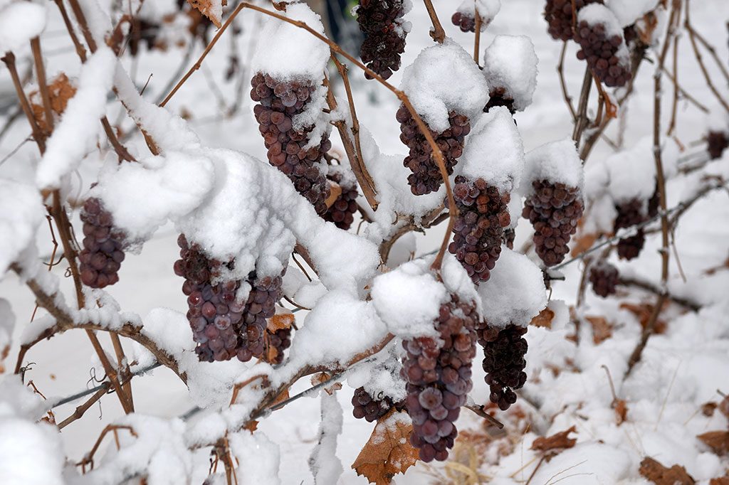 Exceto a Vidal, variedade de uva que resiste ao rigoroso inverno canadense e, congelada, é utilizada na produção de um excepcional vinho de sobremesa, o icewine. Essa variedade, bem como algumas outras, permanecerá ainda nas videiras por longos dois meses após a colheita das últimas uvas, recebendo sucessivas nevascas.