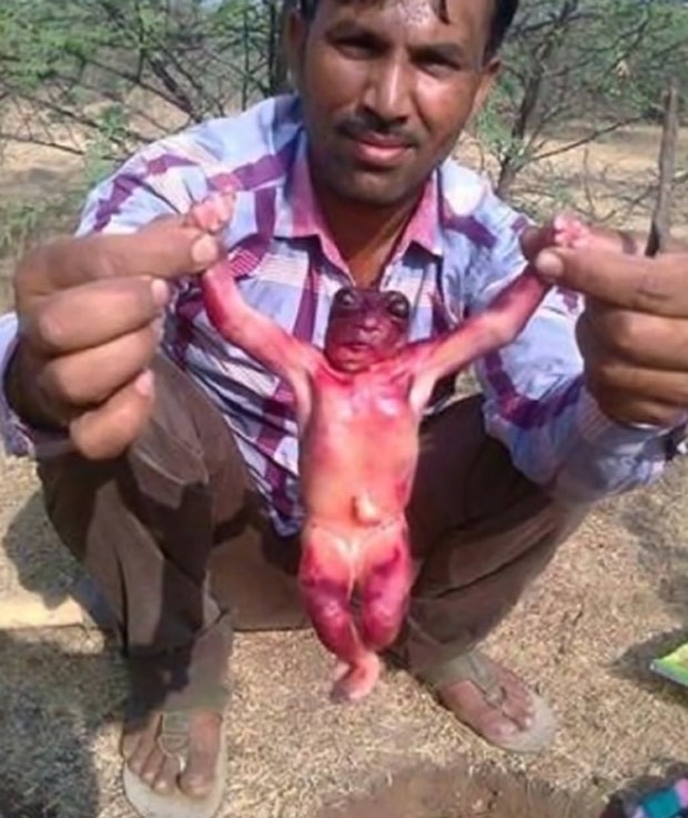 Na imagem que se tornou viral na internet, um homem é visto segurando a suposta criatura, que teria quatro dedos nas mãos. A imprensa indiana levantou a possibilidade de que poderia ser o feto de algum animal.