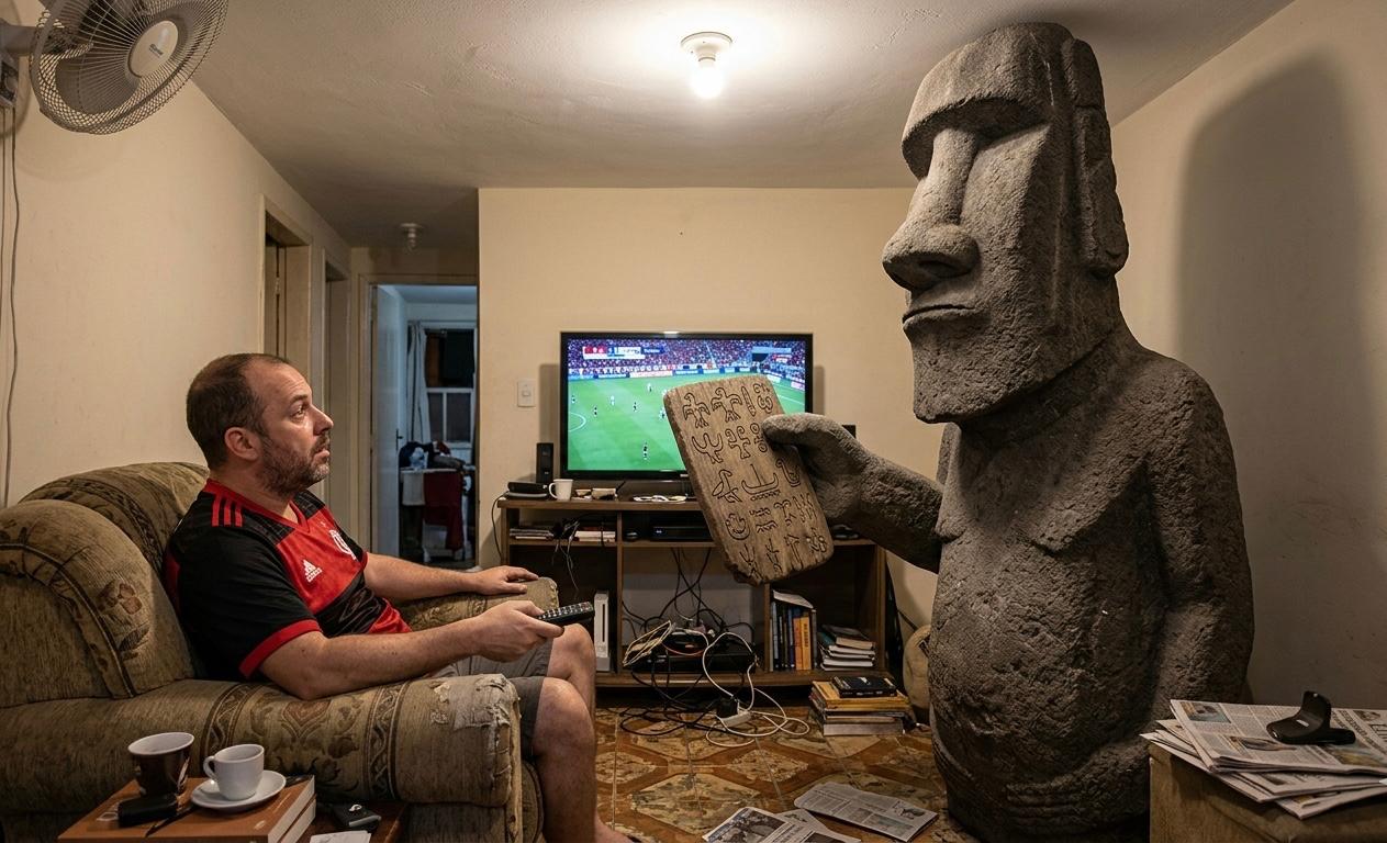 Pouco depois de começar o segundo tempo, um moai se materializou na sala do meu muquifo. Era enorme, muito maior do que eu (o que, diga-se, não é grande vantagem, sou de parca altitude), quase tocava o teto do apartamento. Levei um susto, claro, que logo deu lugar a uma sensação de familiaridade, quando a estátua começou a falar em carioquês castiço – na verdade, no dialeto de uma torcida organizada do futebol carioca, qualquer uma: