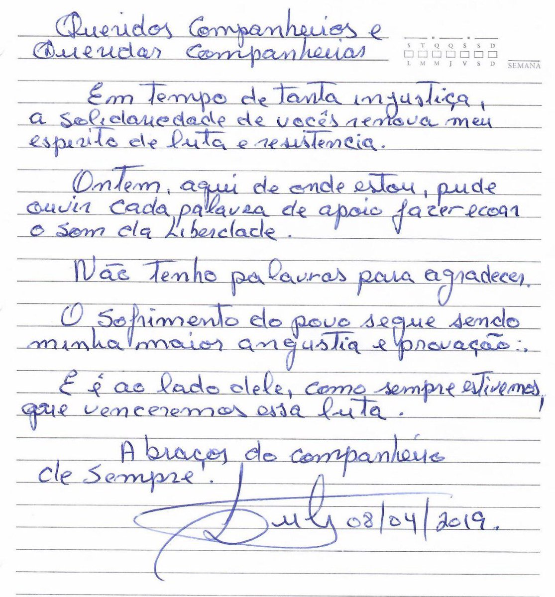 Lula, que completou no domingo, 7, um ano na prisão da PF em Curitiba, agradeceu a seus simpatizantes os atos de manifestação em sua defesa. Foi em postagem no Twitter, na noite desta segunda, 8. Diz um trecho da mensagem manuscrita: “Em tempo de tantas injustiças, a solidariedade de vocês renova meu espírito de luta e resistência. Ontem, pude ouvir cada palavra de apoio e fazer ecoar o som da liberdade”.
