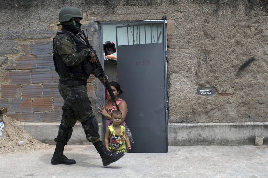 Soldado do exército passa por uma criança, durante operação. Foto: Leo Correa/AFP