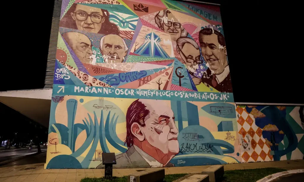 É na avenida que árvores são cobertas por crochês e, na altura da quadra 707, da Asa Sul, uma série de obras figurativas nos muros, de colorido que ajudam a iluminar a noite, deixa os moradores curiosos.