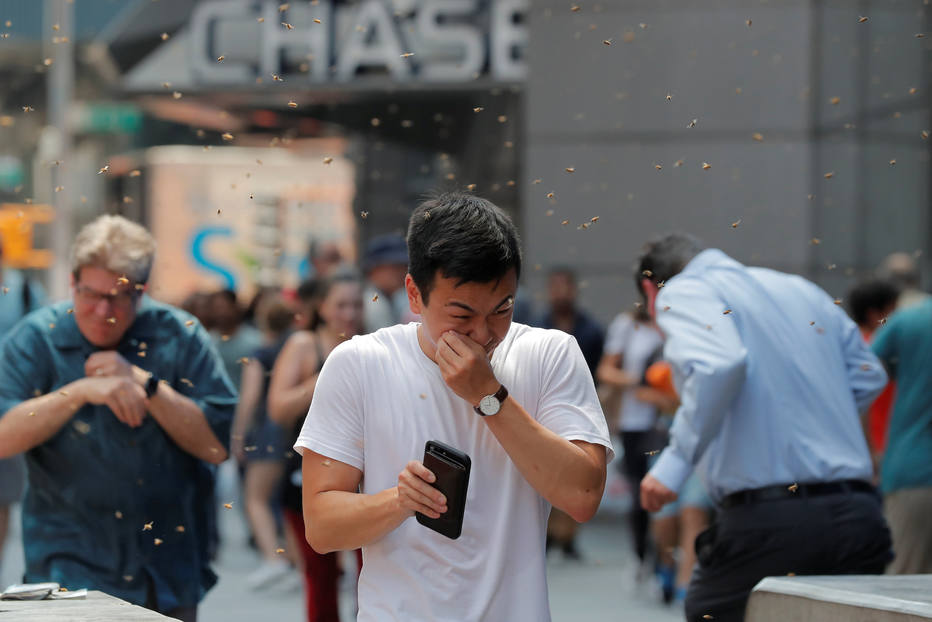 Milhares de abelhas invadiram parte da Times Square, em Nova York, na tarde de terça-feira, 28, e fizeram com que diversos pedestres “lutassem” com elas para caminhar pelo local. O enxame chamou atenção por se concentrar no carrinho de um vendedor de cachorro-quente na rua 43. A massa de insetos eram tão grande que acabou fazendo peso no guarda-sol do comerciante.