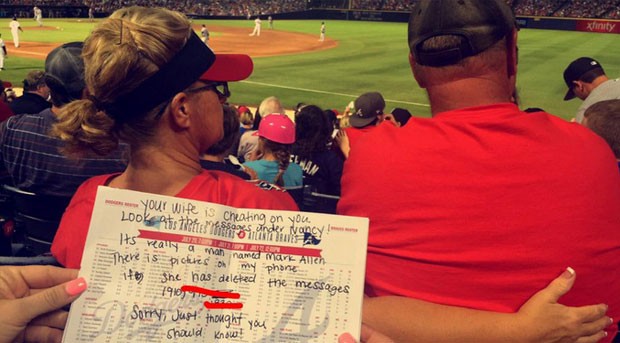 Duas irmãs que estavam em um jogo de beisebol nos Estados Unidos disseram ter flagrado uma mulher trocando mensagens de texto com seu suposto amante ao lado de seu marido em Atlanta, segundo o jornal “New York Daily News”.