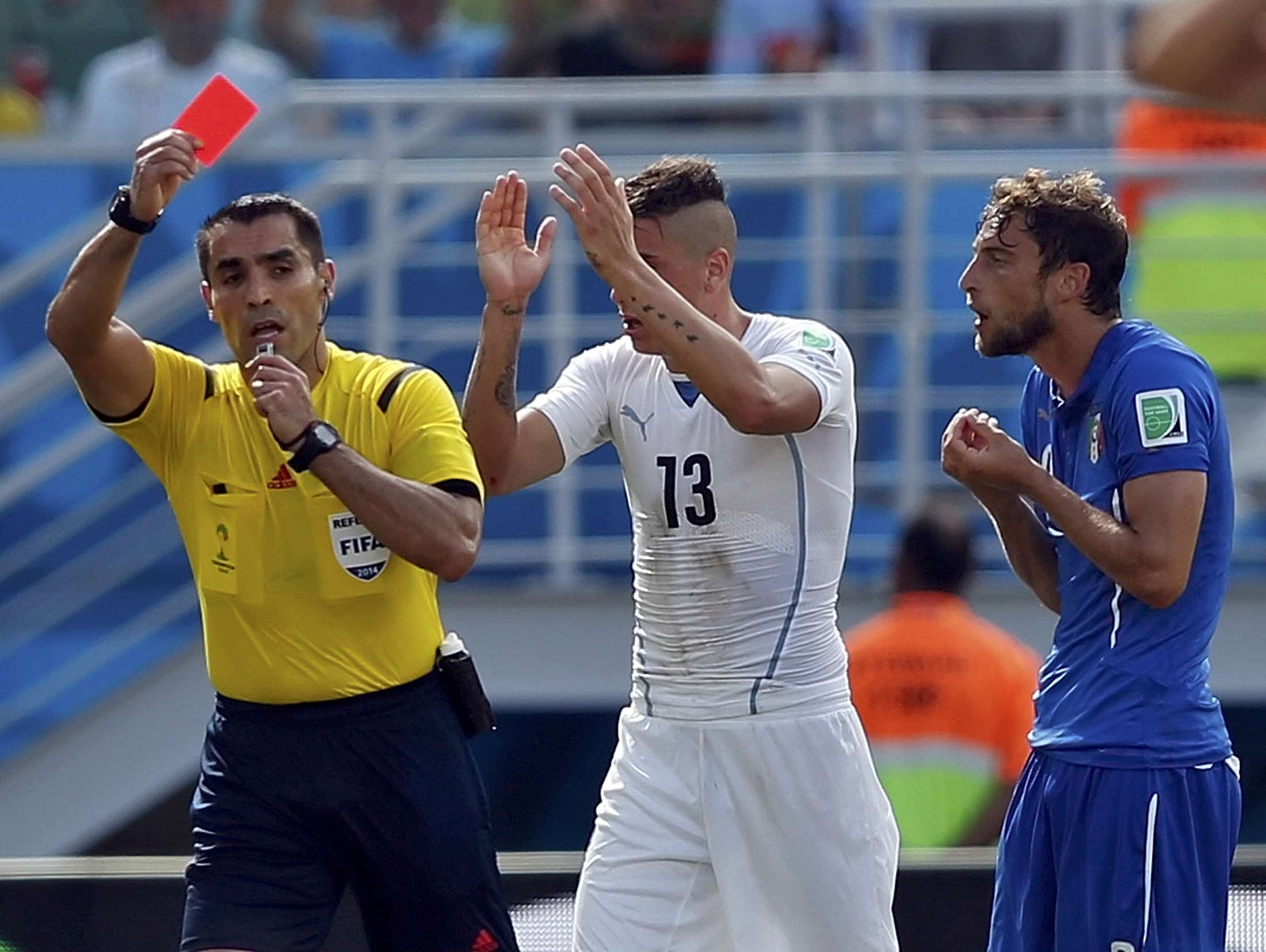 A situação dos italianos ficou mais complicada aos 13min: o meio-campista italiano Marchisio fez dividida forte com Arévalo Rios e o árbitro entendeu o lance como passível de expulsão. Com um a mais, o Uruguai colocou o atacante Stuani na vaga do lateral Alvaro Pereira e se jogou ao ataque em busca de um gol que daria a classificação. Aos 19min, Suárez concluiu chute à queima-roupa para defesa espetacular de Buffon, que mandou a escanteio.