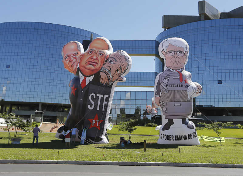 O Pixuleco ganhou outras companhias nesta terça-feira, 30. Depois de carregar para manifestações o boneco inflável vestido de presidiário em referência ao ex-presidente Luiz Inácio Lula da Silva, o movimento NasRuas faz um protesto em frente à Procuradoria-Geral da República, em Brasília, com os “rostos” do procurador Rodrigo Janot e do ministro do Supremo Tribunal Federal, Gilmar Mendes, que receberam os nomes de “Enganot” e “Gil-lax”. Segundo os organizadores, o movimento protesta por uma “Justiça para todos”.