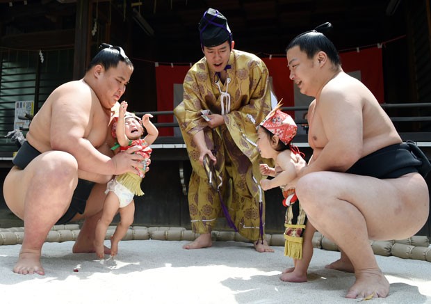Durante o evento, que contou com cerca de 100 participantes, as crianças foram seguradas por lutadores de sumô, com objetivo de fazê-las chorar.