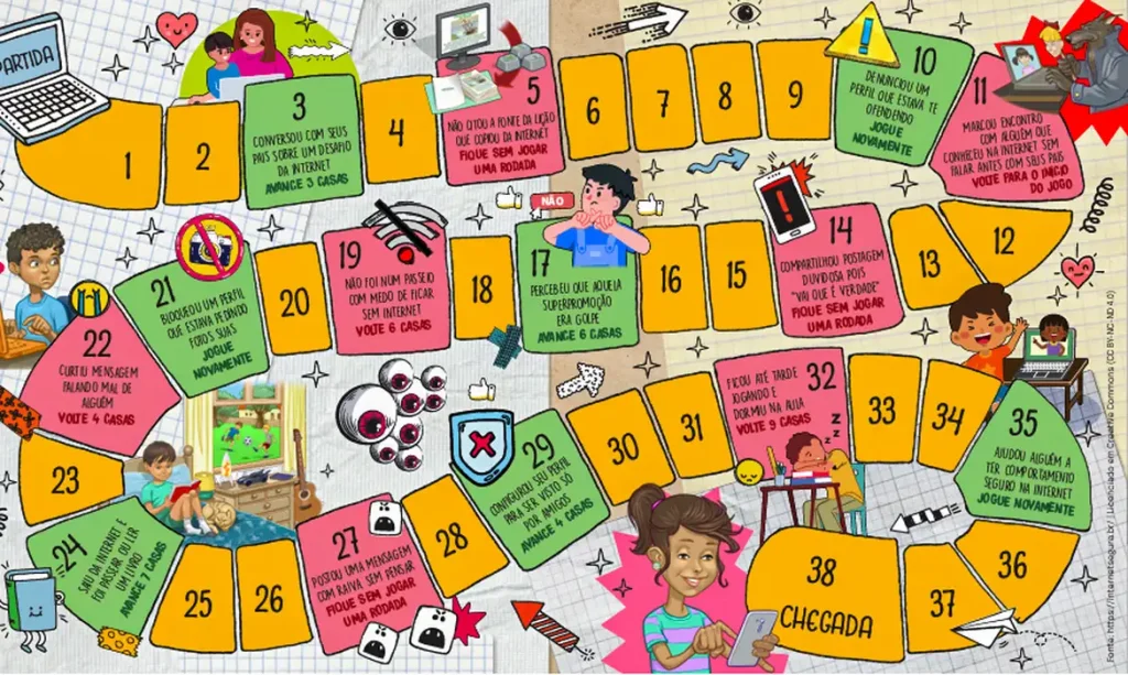 Para brincar, é preciso baixar e imprimir o material, que está disponível no site da Internet Segura, e então recortar e montar um dado e alguns personagens disponíveis no jogo. Depois, basta jogar esse dado e ir pulando as casas correspondentes até chegar ao destino final. Se, no caminho, você cair em uma casa de comportamento arriscado na internet, terá que voltar uma casa ou ficar sem jogar. Ganha o jogo quem tiver um comportamento mais seguro na internet e conseguir chegar primeiro ao ponto final.