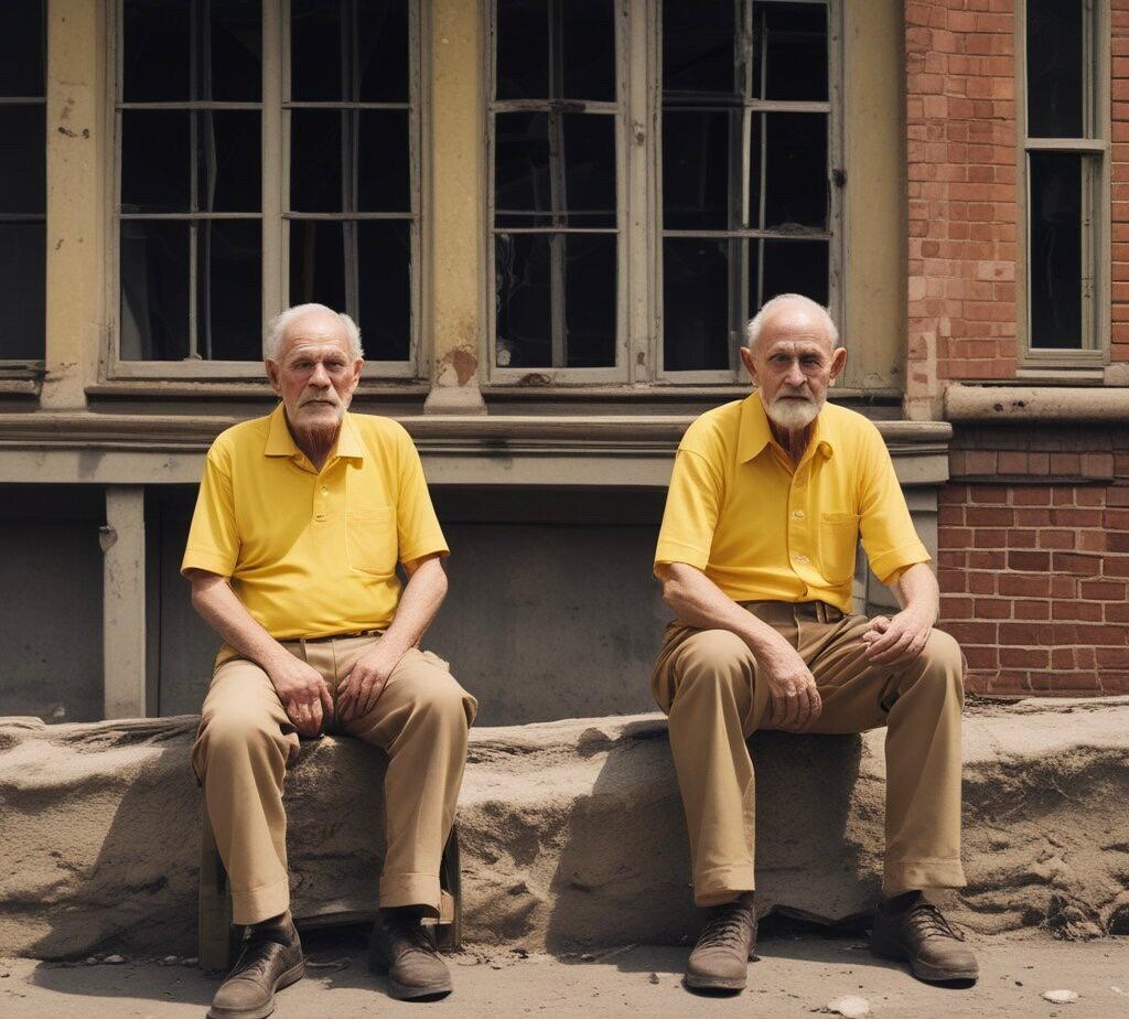 O velho avança, com passos trôpegos, em direção à entrada do quartel. Veste algo que já foi uma camisa amarela, mas que hoje não passa de um trapo rasgado e encardido. Bate debilmente no portão de ferro e começa a chorar. Dois outros idosos observam a cena.