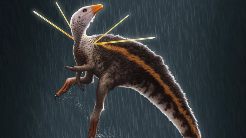 Do tamanho aproximado de uma galinha, a nova espécie revelada pelos cientistas tinha uma crina ao longo do dorso e um par de “fitas” alongadas e rígidas provavelmente saindo do ombro — características nunca vistas antes em fósseis de dinossauros.