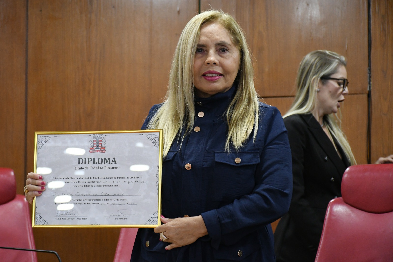 A Câmara Municipal de João Pessoa entregou em sessão solene o Título de Cidadã Pessoense à professora de Educação Física Karla Françoise da Costa Alencar. A solenidade reuniu amigos e colegas de trabalho da homenageada e foi proposta pelo vereador Zezinho Botafogo (PSB).
