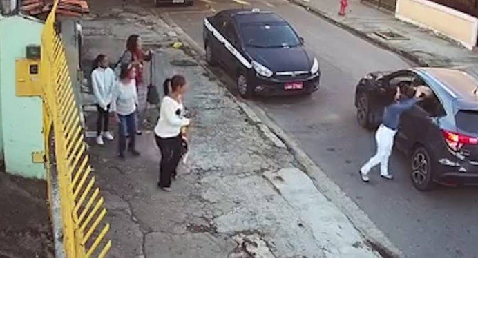 As imagens mostram quatro mulheres e uma criança na calçada quando um carro para. Elas interrompem a caminhada. Uma delas vai até o carro e joga a bolsa pela janela. As outras repetem o gesto, inclusive uma que está com um cachorro. As imagens não mostram os bandidos e nem armas.