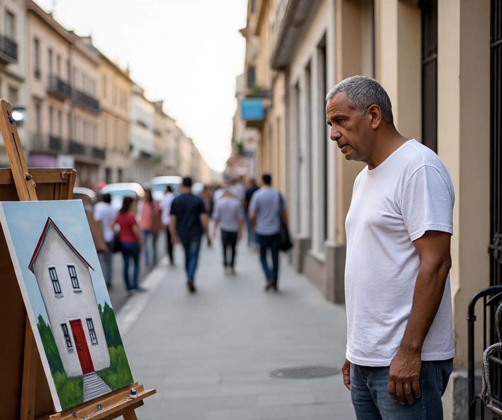 Entre os quadros do pintor de rua descobriu um que lhe despertou especialmente a atenção.