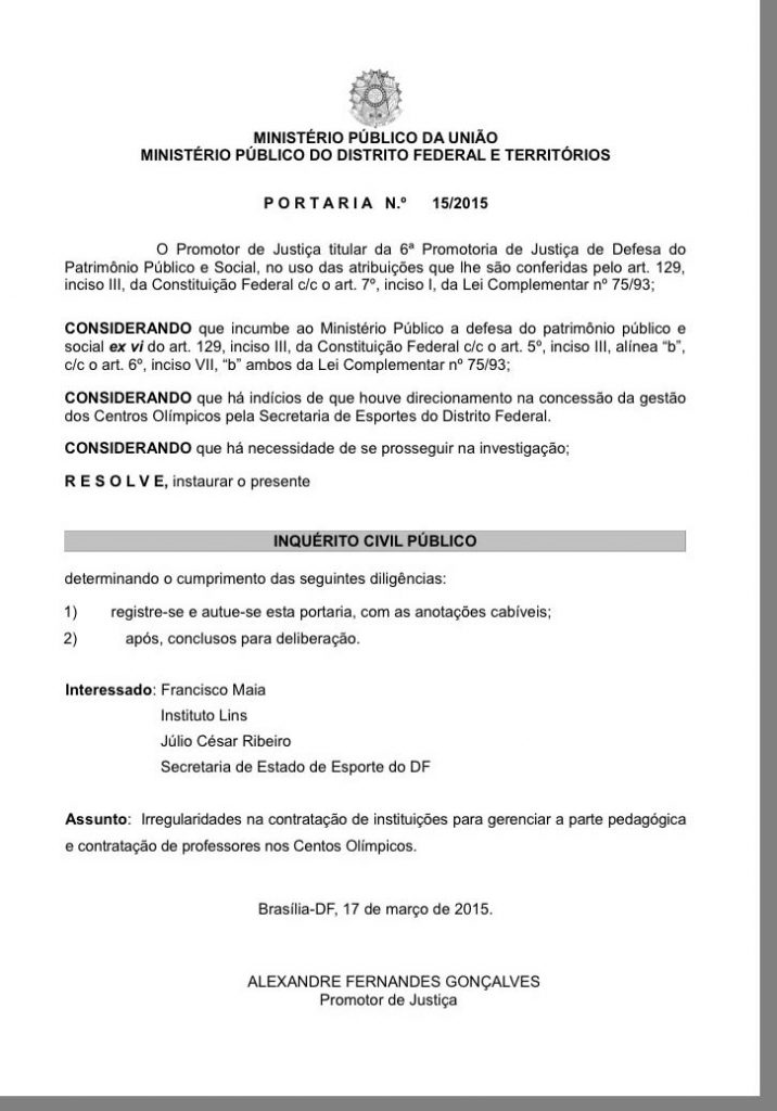 O convênio prevê a gestão pedagógica do Centro Olímpico de Sobradinho. O Ministério Público e a Polícia Civil investigam Júlio Cesar desde a época em que o deputado estava à frente da Secretaria de Esportes no governo de Agnelo Queiroz. Outros servidores da pasta também estão sob investigação.