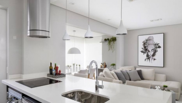 Detalhe que salta aos olhos, a intensa luminosidade que emana do ambiente não foi obtida por acaso. Para começar, o piso de porcelanato branco e brilhante foi mantido. “Ela queria algo básico e moderno ao mesmo tempo. Por isso, optamos por uma base branca e cinza e exploramos melhor os recursos de iluminação”, diz. Além de luz direta proveniente de um trilho de spots, luminárias pendentes foram instaladas na sala de jantar e na cozinha.